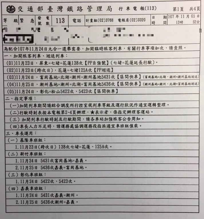 ▲圖為台鐵昨日發佈到各機務段的電報,顯示因應年底大選,僅確定加開1列次對號列車,比往年少上100列,甚至更多。(圖/讀者提供)