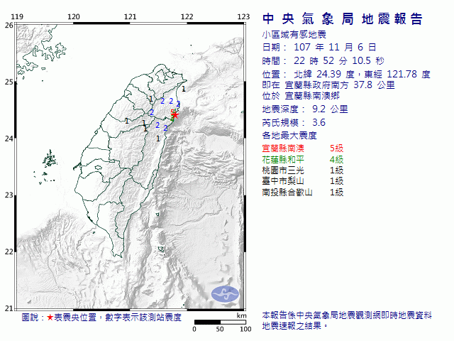 地牛翻身!宜蘭6日晚間22時52分發生芮氏規模3.6地震,地震深度9.2公里,各地最大震度,宜蘭南澳5級;花蓮和平4級;桃園市三光、台中市梨山、南投縣合歡山1級。