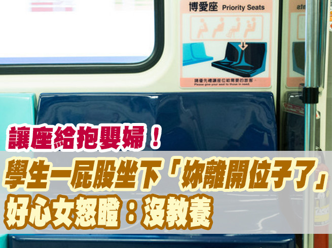 一名女網友搭捷運要讓座給一名抱著嬰兒的婦人,但她起身後,位子立刻被一名學生坐走,她和對方溝通卻被回「可是妳已經離開位子」,因此發文尋求公評,「如果是我小孩,這種觀念和態度一定會打一頓。」對此,網友出現正反意見,有人認為該學生會不會是特殊孩子,得多點體諒;也有人說,「全車的人都需要再教育」。