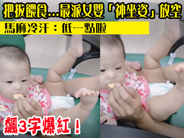 「最派女嬰」小妡妡打針氣飆3個字爆紅!媽咪蔡佩蓁昨晚在臉書又獻上超萌影片,那時他們在等醫師給口服疫苗,把拔怕她之後肚子餓,所以就先餵她吃嬰兒餅乾,沒想到小妡妡在咬的同時,小腳超不安分,而這個海派坐姿也引來不少網友朝聖,直喊「開粉絲團了。」