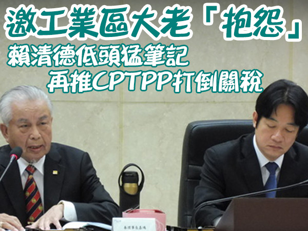 行政院長賴清德7日與中華民國工業區廠商聯合總會座談會,會前致詞時理事長秦嘉鴻不客氣批評一例一休的政策就是給政府一個教訓,未來政策推出前應該與企業溝通;賴清德則低頭猛筆記,並解釋先前秦嘉鴻的建言包括,五缺、山坡地回饋、海外資金回流等都已經在盤點或已解決,更強調為了協助企業立足台灣佈局全球,總統蔡英文也指示行政院積極加入CPTPP(跨太平洋夥伴全面進步協定)的各種工作,努力突破關稅壁壘。