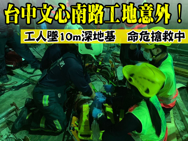 ▲台中文心南路工地沈姓工人墜落10公尺深地基命危。(圖/記者莊智勝翻攝,下同)