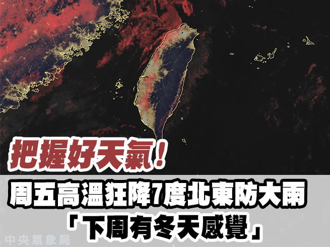 氣象局提醒,周五至周六晨間東北風稍增強,迎風面的北部及東半部地區降雨機率提高,並有局部較大雨勢發生的機率;這波東北風也會對北部及東北部地區造成顯著的降溫,高溫降幅可達4至7度左右,其他地區溫度的變化則不明顯。