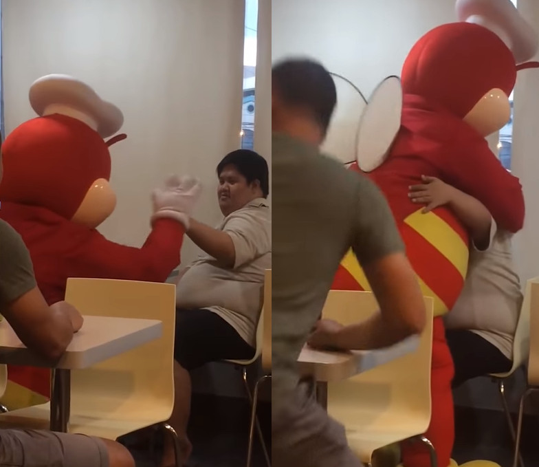 根據外媒報導,美式速食店「快樂蜂(Jollibee)」在菲律賓非常有名,而他們的吉祥物即是一隻「紅色蜜蜂」。當天一名身穿米灰色衣服的唐氏症男孩,獨自一人坐在速食店裡吃東西,身影看起來有點孤單,這時旁邊突然出現一位穿著蜜蜂裝的員工,不僅坐下來陪他玩,還在要回到工作崗位上時,跟他擊掌並送上一個大大的擁抱跟吻。