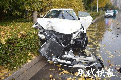 豈料樂極生悲,由於這幾天宿遷市都是落雨不斷,不僅能見度低,地面更是十分濕滑,在湯男加速後,超跑直接失控撞上了道路兩邊的綠化樹木上,無辜的樹被攔腰撞斷,價值百萬的名貴轎車成了廢鐵,畫面慘不忍睹。