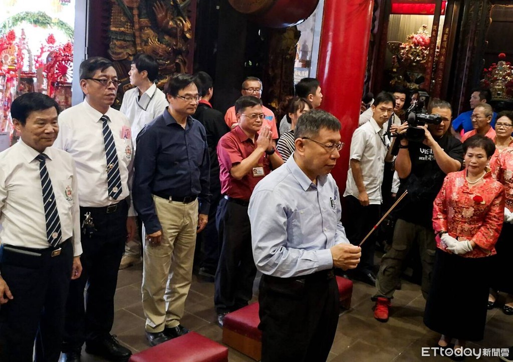 台北市長柯文哲暫時卸下市政重擔,8日開始專心跑選舉行程拚連任,上午結束濱江市場掃街後,中午來到松山區的台北府城隍廟參拜,巧妙與民進黨吼選人姚文智錯開,而國民黨候選人丁守中則是派代表前來上香祝壽。
