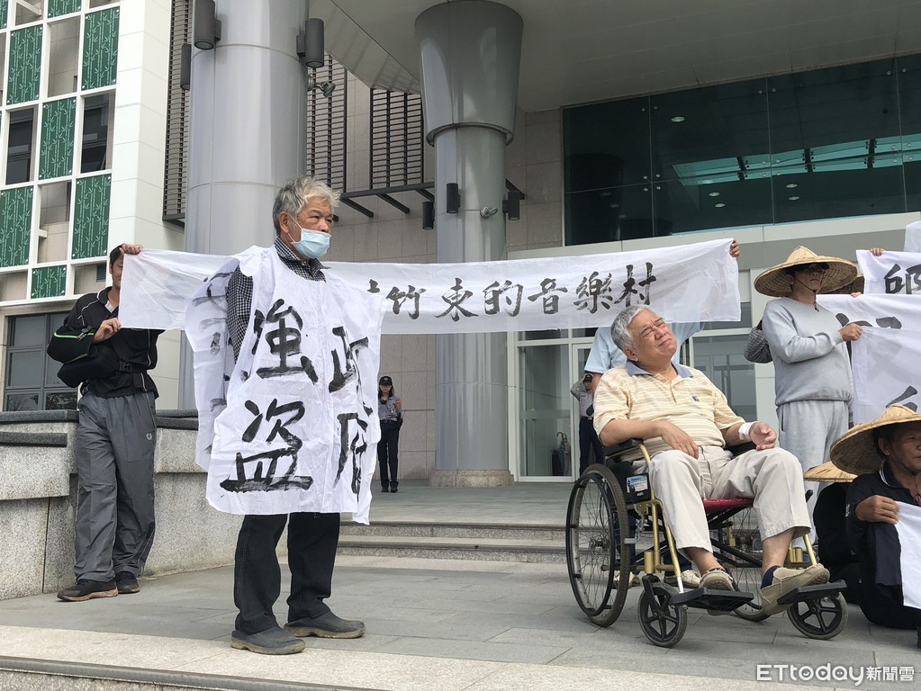 ▲傅春雄因竹東客家音樂村土地徵收問題,遭新竹縣政府狀告,8日上午傅春雄抱病出席開庭,他坐在輪椅上與其他地主一起在新竹地方法院門口召開記者會。(圖/記者陳凱力翻攝)