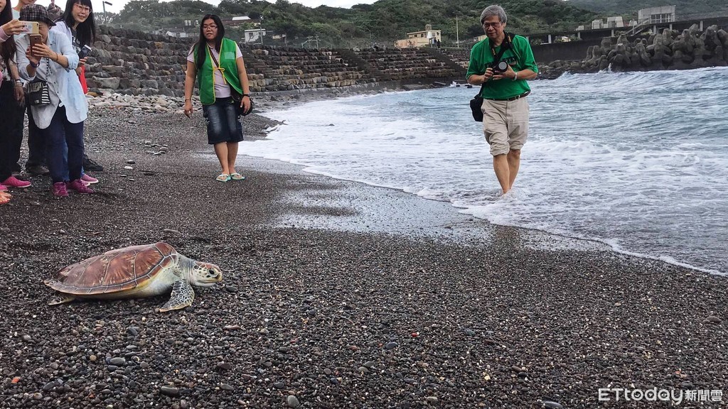 5日上午保育區潮境公園成了海龜野放基地,基隆市政府產發處、動保所、新北市政府動保處、海科館、福智佛教基金會志工等,與海大海龜救傷中心教授程一駿等,帶著4隻已恢復活動力的健康海龜進行野放,一次野放4隻海龜很少見,大家都很興奮,看牠們重回大海的景象。