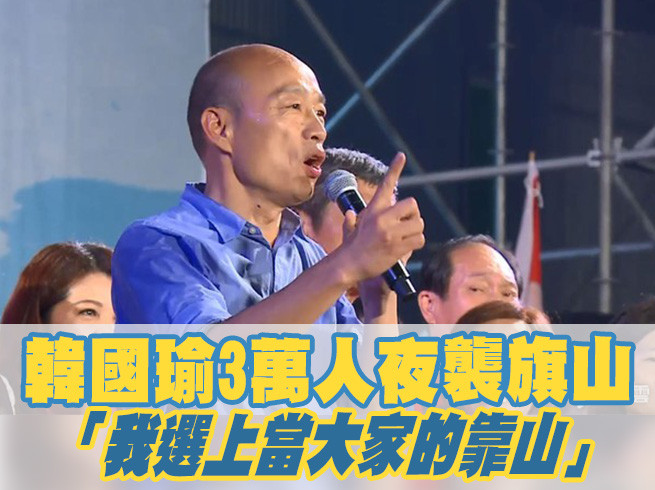 國民黨高雄市長候選人韓國瑜8日在旗山舉辦造勢晚會,主辦單位宣稱至少有3萬多人到場支持,韓國瑜入場時被熱情粉絲包圍,短短50公尺就走了近20分鐘。他說:「全台灣民進黨瘋狂打韓國瑜」、「我們再也不要貧窮、不要意識形態、不要泛政治化」、「我選上市長,保證做大家的後盾、做大家靠山。」