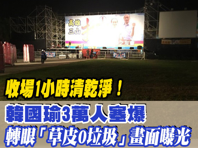 國民黨高雄市長候選人韓國瑜前進大旗山地區,8日在美濃的高美醫專操場舉辦造勢晚會,主辦單位宣稱至少有3萬多人到場支持,熱情的粉絲揮舞國旗、吶喊韓國瑜凍蒜,最讓人另眼相看的是,活動8點20分許結束後,短短1小時內就把場地復原,草地上幾乎看不到一個垃圾。