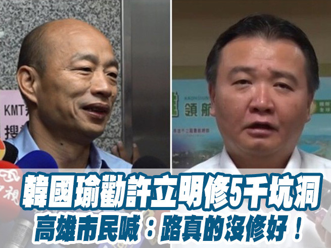 國民黨高雄市長候選人韓國瑜8日晚間在造勢大會口誤表示,當選後要把「白玉苦瓜」等農產外銷出去,讓高雄市代理市長許立明在臉書酸說「白玉苦瓜是瞎密啦!哩演麻演像一點」。對此韓國瑜笑著回應,「你5千坑洞補好了嗎?」沒想到此話一出,許多高雄市民紛紛表示,高雄的路真的很多坑洞。