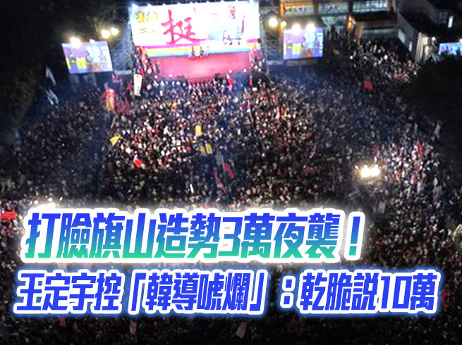 國民黨高雄市長候選人韓國瑜8日挺進大旗山地區,於美濃的高美醫專操場造勢,據主辦單位表示,現場吸引破3萬人到場支持。不過,民進黨立委王定宇分享臉書粉專「只是堵藍」的照片,指3日陳其邁勞工之夜造勢活動共2萬人參加,該地面積21840平方公尺,而高美醫專面積才7368公尺,韓國瑜竟稱超過3萬人,「要膨風乾脆說已經擠進十萬人啦」。