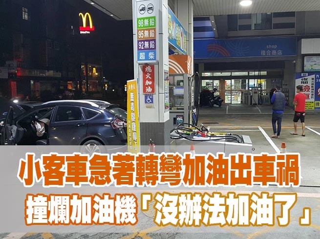 ▲自小客車沿鶯桃路左轉欲往加油站加油時,疑因未禮讓對向直行的車輛,發生碰撞,還撞壞了加油站的加油機。(圖/記者林裕豐翻攝)