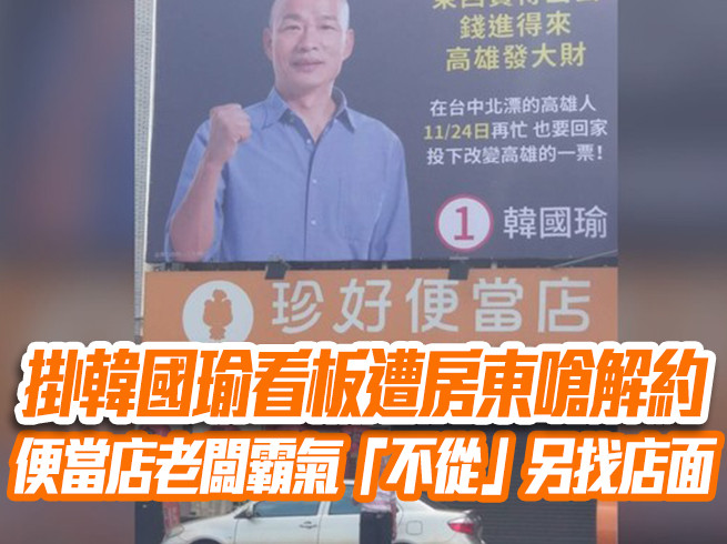 南屯某家知名連鎖便當店2周前掛上國民黨高雄市長候選人韓國瑜大型看板,結果房東9日竟要他卸下,否則解除租賃契約。消息被PO網立刻引起熱烈討論。「北漂」的便當店陳老闆也霸氣在店門口放上「不從」看板,請大家幫忙另找店面。