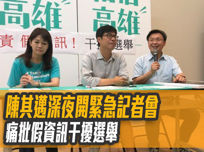 ▲高雄市長民進黨候選人陳其邁深夜穿短褲,召開記者會痛斥假資訊。(圖/記者宋德威攝)
