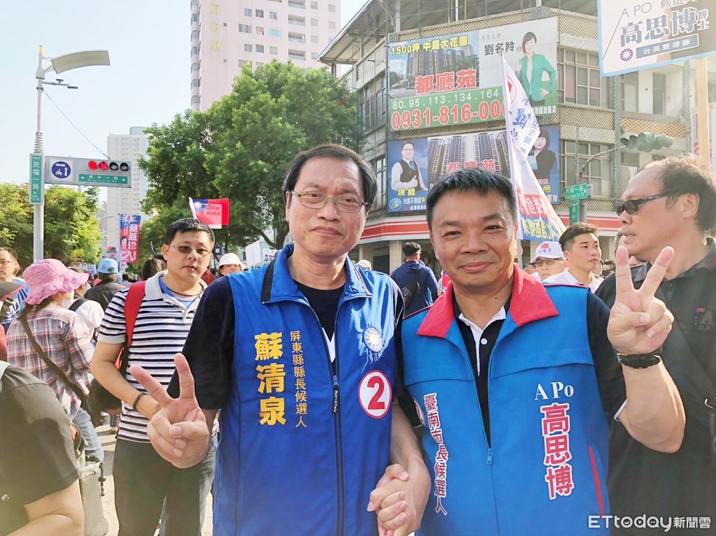 ▲蘇清泉(右一)和韓國瑜參加反空汙大遊行▼蘇清泉和台南市候選人高思博。