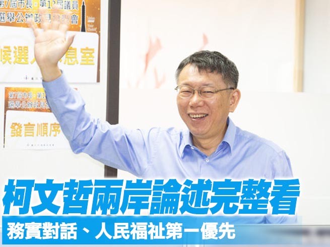 2018台北市長選舉公辦政見發表會11日下午登場,台北市長柯文哲針對兩岸議題發表完整論述。他指出,台灣有47%經貿對象都是中國大陸,更有兩百萬台灣人在大陸經商、求學、工作甚至養老,因此兩岸議題應當講求「務實對話」,要把人民福祉當作第一優先。