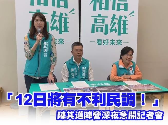 民進黨高雄市長候選人陳其邁11日下午在旗山造勢後,競選辦公室深夜再開記者會,表示民調封關在即,這兩天會有媒體釋出不利民調打擊綠營,藉此傳遞韓國瑜陣營領先的訊息。總幹事劉世芳提醒,選前重要關頭,對方民調沒一樣是真的,希望支持者別被混淆視聽,因為民進黨有信心拿下大岡山、大旗美地區選票,僅鳳山選區需再努力。