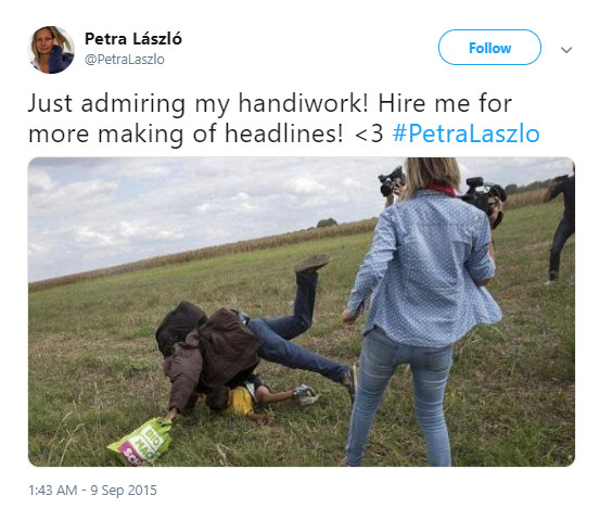 匈牙利女攝影師佩特拉•拉茲洛(Petra Laszlo)在2015年時,被派匈牙利與塞爾維亞邊境,以記錄試圖越過歐洲進入奧地利和德國的移民潮;不過就當難民群在奔逃時,佩特拉•拉茲洛先是絆倒一名抱著小孩的父親,隨後又在一片混亂之中將右腳伸出,試圖絆倒一名從她身邊經過的女童。畫面一出,立即引起國際社會的撻伐,佩特拉•拉茲洛隨後在2017年時被判處3年緩刑,不過匈國最高法院在6日時,又改判該名攝影師無罪。