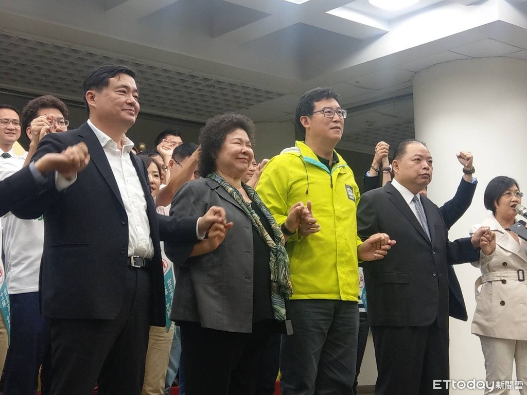 ▲總統府秘書長陳菊、民進黨秘書長洪耀福12日與民進黨台北市長候選人姚文智及27位市議員候選人召開記者會。(圖/記者蔣婕妤攝)