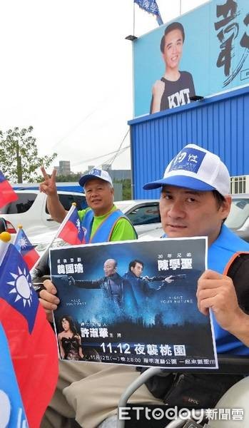高雄市長候選人韓國瑜12日晚間到桃園,和同黨市長、市議員候選人舉行合體造勢,活動展開前,支持國民黨桃園市長候選人陳學聖的桃園市脊髓損傷者協會常務理事戴軍豪,秉持感恩的心,號召協會成員吳紋垂合組「三輪機車宣傳隊」,在機車週邊張貼網友KUSO海報沿街宣傳,要替陳學聖匯集更多人氣。