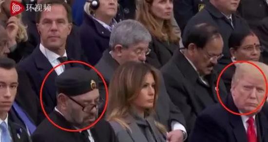 法國巴黎12日舉行一戰結束100周年的紀念活動,當法國總統馬克宏(Emmanuel Macron)在台上發表演說時,台下的摩洛哥國王穆罕默德六世,坐在川普夫人梅蘭妮亞(Melania Trump)身旁睏得頻頻點頭,幾乎要睡著了,此時鏡頭逐漸往右偏移,希望能避免這尷尬的畫面;結果意外地又捕捉到了川普總統的奇特反應,川普沒有看著台上的馬克宏,反而全程「皺著眉頭」盯著穆罕默德六世「打瞌睡」。