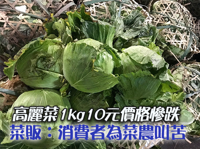高麗菜產量過剩價跌,許多菜農抱怨高麗菜才上市,照理還在嚐鮮期,但今年完全沒蜜月期,市場交易價格幾乎跳空下跌,盼政府別只顧拚選舉,應該要限制進口高麗菜,否則本土蔬菜將有一連串菜價慘跌的連鎖反應,台北果菜市場菜販預估,這種情況還要維持20天。