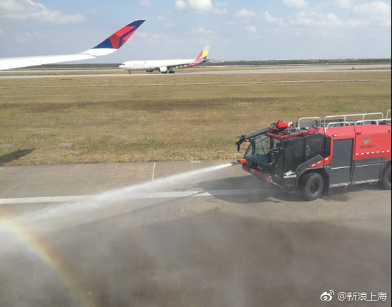 ▲達美航空班機上海浦東機場中斷起飛,消防車朝機輪灑水降溫。(圖/翻攝新浪上海)