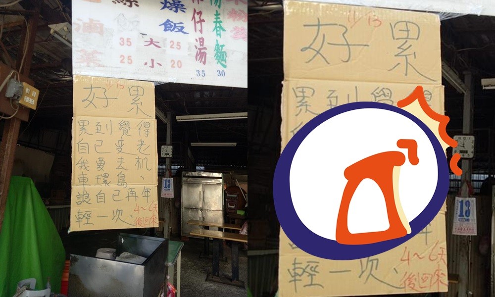 一名網友在臉書《爆怨公社》表示,「昨天師父有吃到鹹飯(鹹粥)」,今天中午想說來吃」,沒想到店關著,門口還是一堆人。接著看看原PO貼出的照片,這間小吃店門口貼著一張厚紙板,上面寫下「11/13 好累 累到覺得自己變老,我要去機車環島,讓自己再年輕一次,4~6天後回來」。