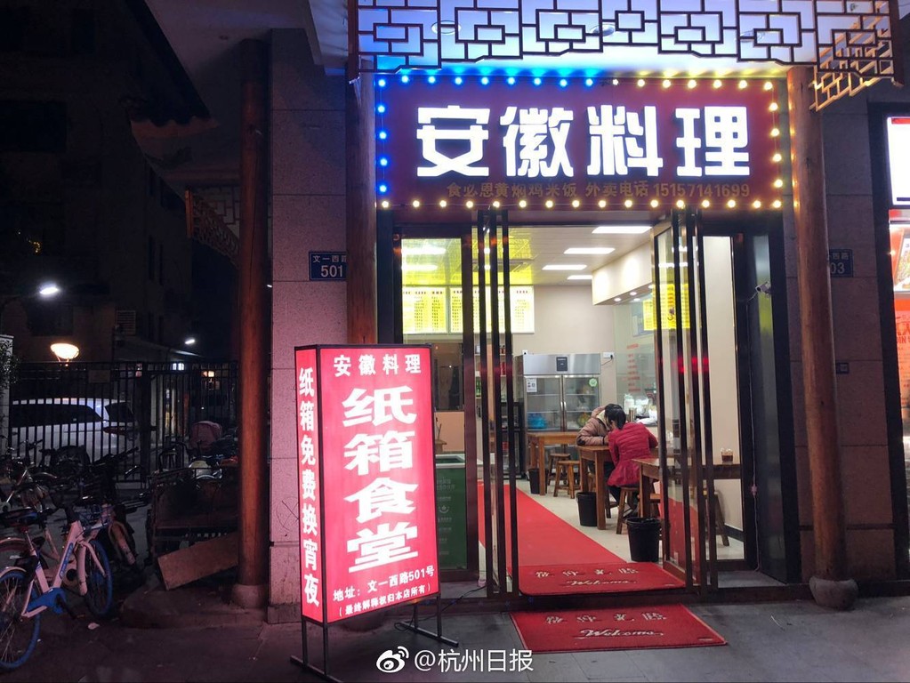 位於杭州市西湖區文一西路的這間小吃店專做安徽料理,近來因為「紙箱換免費食物」吸引多家媒體報導,還稱它像是現實版的「深夜食堂」。根據《澎湃新聞》,老闆孫長金表示,這家店是「紙箱食堂」,會想到用紙箱換食物的做法源於周遭環境,由於店面靠近一個小區,每天都有很多快遞進出,紙箱丟的到處都是,「我認為這種行為非常不文明,也破壞城市環境。」