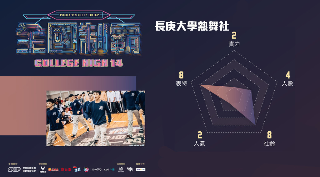 長庚大學的POPPING團,在CH10~CH12都留下不錯的作品,在CH10 更是以五人小組一路殺前四強,是當屆的大黑馬。據說學校課業很繁重,可能多少也影響同學練舞的興致,希望CH14的經典團體賽可以再次見到長庚大學的蹤影,說不定排個厲害的作品,期末還是可以高分歐趴的呢!