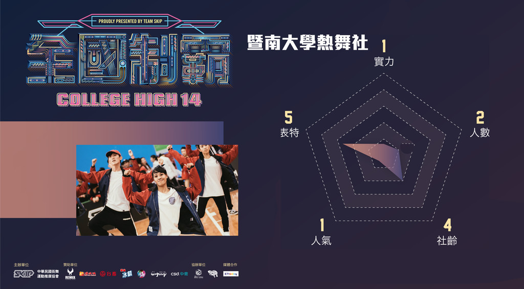 去年CH13的團體賽,暨南大學派出HIPHOP及LOCKING兩支隊伍,HIPHOP組的編排略顯生澀,LOCKING組的編排則是相當扎實是很不錯的。若可尋求專業教練 提昇1.選手的心肺能力 2.抗壓性 3.編排靈活度,相信舞技就會有革命性的進展,進而帶動全隊的戰力,晉升A級強隊之林。