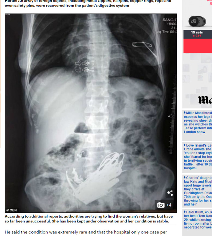 印度一名40幾歲女性在上個月因為腹痛就醫,隨後被安排住院,不過醫生卻從該名患者的X光片中,發現她的肚中滿滿都是「尖銳的金屬物品」,造成她的未變的十分堅硬,她的肺部還有一個安全別針突出的形狀。醫生表示,這名女性應該是患有罕見的心理疾病「異食癖(又稱異食症、亂食症)」,這種病例相當少見,一年大概只會出現一個。