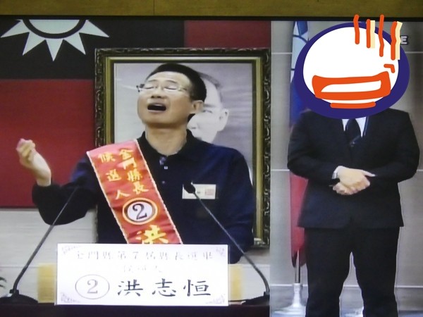 金門縣長候選人洪志恒2年前參選立委,政見發表會一上台就忘我開唱「萍聚」,結束前又來首「花心」;今年參選他又在14日的政見會上獻唱「心經」,現場有人立馬偷笑,不過旁邊的手語翻譯老師先是鎮定微笑,三秒後就開始淡定翻譯。
