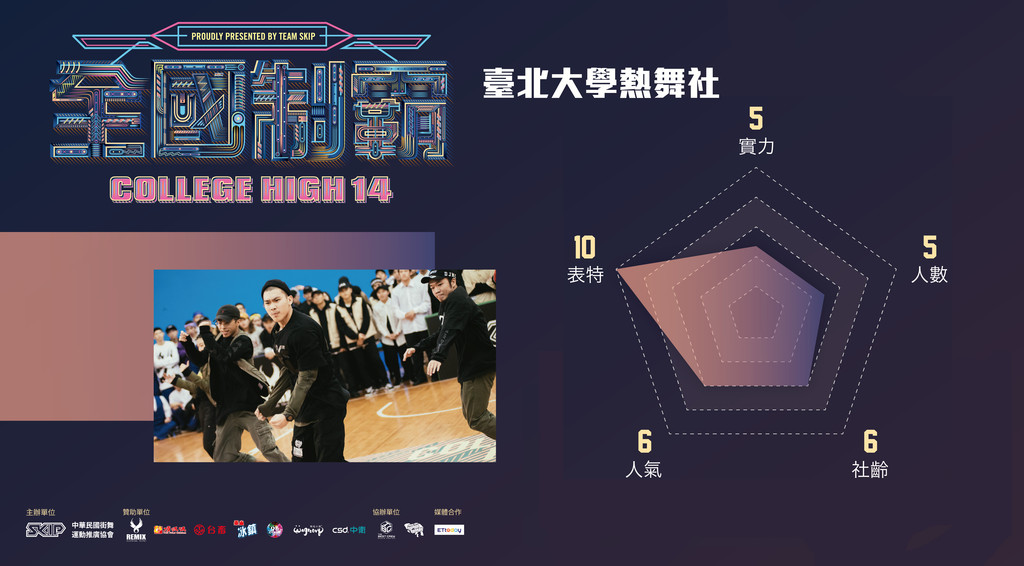 台北大學熱舞社身為北區舞展的主辦單位。於CH1的POPPING項目就開創4打5的先例,是史上第一支以少敵多的隊伍。而半年後的CH2 POPPPING組補齊5人後果真全國制霸。而CH10有駿學長 VS 北市大之POPPING死鬥以及OBS不輸職業等級的北大夢等等......北大軍團留下許多公開賽的美麗畫面。去年CH13似乎面臨換血,縱使有著如此輝煌的戰績,也是出現難得的海選大槓龜。經過一年,期待CH14戰力更升級。主催北區舞展還能組織代表隊大殺全國制霸,這樣的熱情很不簡單『謝謝北大多年對大家的付出,辛苦了!』