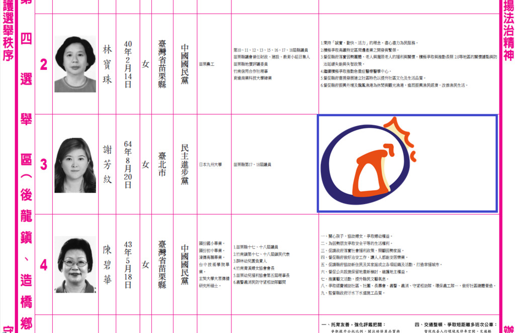 在苗栗縣議會第19屆議員選舉的選舉公報上,除了有候選人的大頭照、出生年月日、競選號碼、出生地和學經歷外,還有一大格政見欄位,給候選人們提出自己的看法或想法。而今年中選會首次開放圖檔上傳,使政見欄不再只有文字,還可以有插畫美編,或是附上粉絲專頁的QR code,讓選舉公報變得更活潑。