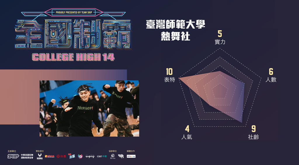 台灣師大是HUG SEASON(前全國舞展)的主辦學校,每年的成果發表很受好評,排舞的功力有目共睹,這樣的特性也反應在大學爽的歷屆賽事,算是排舞優於尬舞的一支隊伍。去年CH13台灣師大火力全開,改寫這樣的評價,HIPHOP組表現穩健,LOCKING組超酷炫博得滿堂彩並殺入四強,POPPING組更是以黑馬的姿勢勇奪亞軍,慢慢也朝著準A級的隊伍邁進,如果不好好準備海選舞,台灣師大可是會K得大家滿頭包唷。