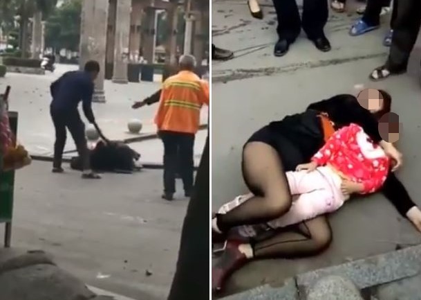 ▲蔡女抱著女兒躺在路邊,全身被打得到處都是傷,孩子卻被保護得毫髮無傷。(圖/翻攝自微博/新浪新聞客戶端)