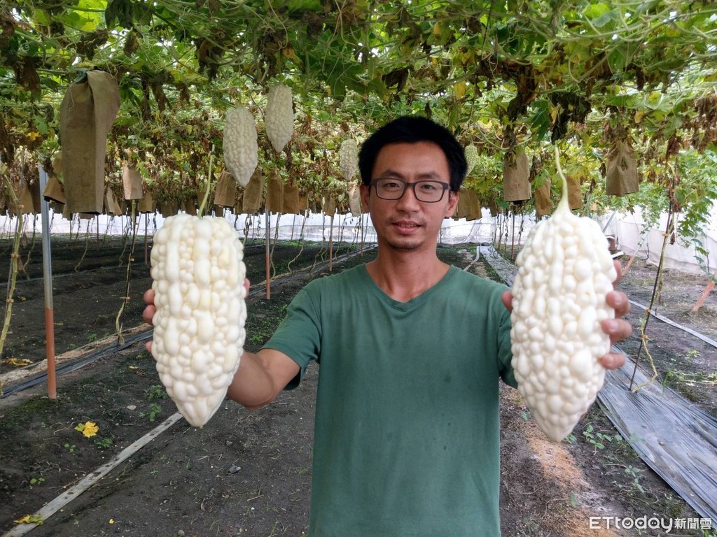 ▲蔡坤良拿著自己栽種生產的碩大苦瓜。(圖/記者陳崑福翻攝)