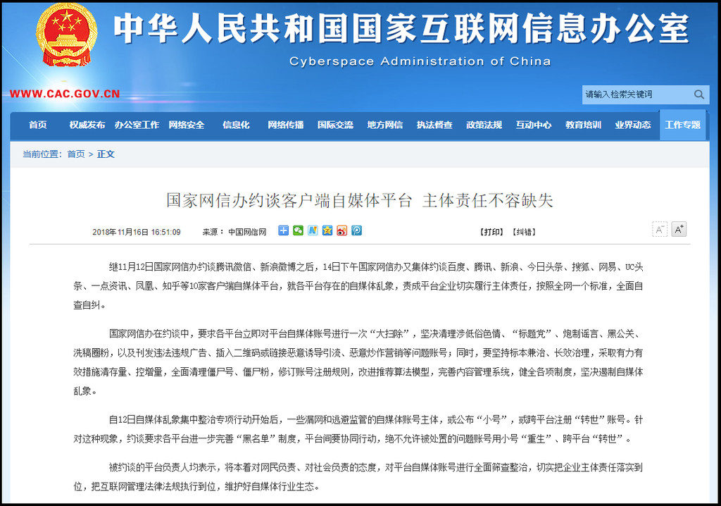 中國大陸國家網信辦近日約談騰訊微信、新浪微博後,14日下午又約談包含「百度、騰訊、新浪、今日頭條、搜狐、網易、UC頭條、一點資訊、鳳凰、知乎」等10家客戶端自媒體平台,要求各平台清除低俗色情、製造謠言、黑公關(杜撰負面新聞)、「標題黨」等違規帳號,同時採取有效措施清存量、控增量,改進推薦算法模型等,希望藉此遏制自媒體亂象。