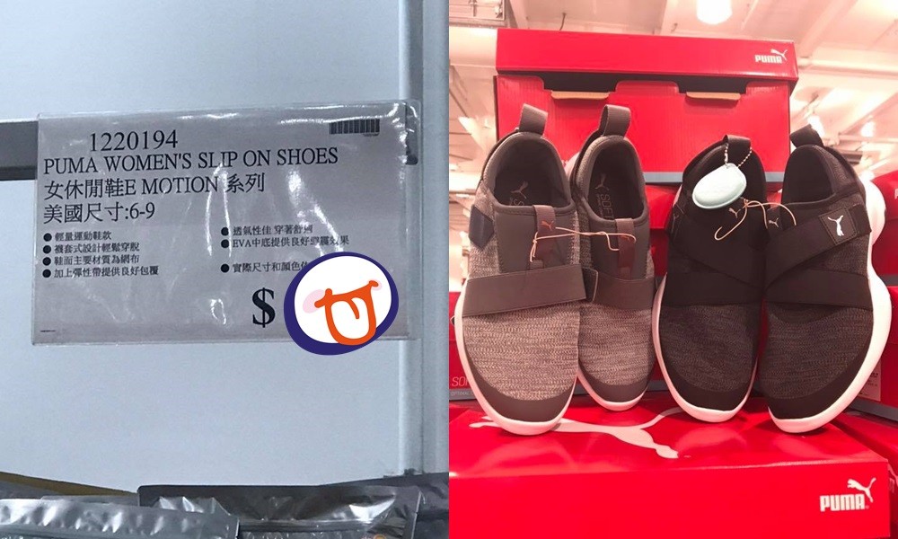 一名女網友日前到好市多中壢店消費,回家後在臉書《COSTCO 好市多 消費經驗分享區》貼文,分享一款「PUMA休閒女鞋E MOTION系列」一雙只要999元「蠻輕的~貨量還很多,我不知道其他分店有沒有…」仔細看看照片,標示上寫著這款商品是「PUMA WOMEN'S SLIP ON SHOES 女休閒鞋E MOTION 系列」,顏色則有黑和灰。
