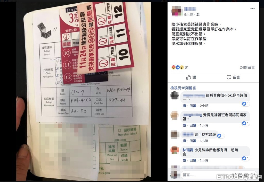 新北市一名家長在臉書貼文,「陪小孩寫美語補習班作業時,看到護家盟竟把選舉傳單訂在作業本,簡直氣到說不出話,怎麼可以訂在作業裡!沒水準到這種程度。」原來是她的女兒在永和「語言盒子」美語補習班上課,回家作業竟用釘書機釘著2張反同公投宣傳單,她直說真的太扯了。