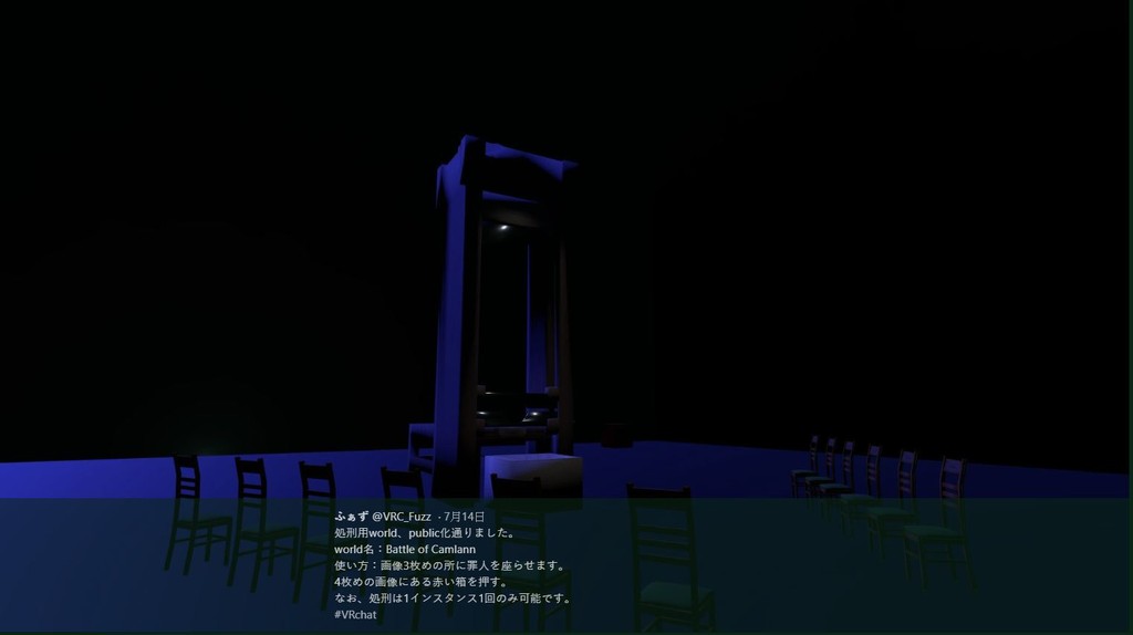 網友「narihara」在推特上發布自己在朋友的建議下玩這套《Battle of Camlann》遊戲,而這個遊戲主要的內容被設定為所有玩家都處於一個狹窄陰暗的空間,中間有一個巨型的斷頭台,斷頭台周圍則是擺放好幾張椅子。主要玩家的生死還可以被其他玩家操控,narihara表示,剛開始玩的時候感到非常期待、興奮,但在斷頭刀準備下墜前,傳出了「死亡的鐘聲」,似乎在提醒他快死了,眼看旁邊的刀片開始落下,他摒住呼吸並大喊「我並不想死!這只是個虛擬空間。」