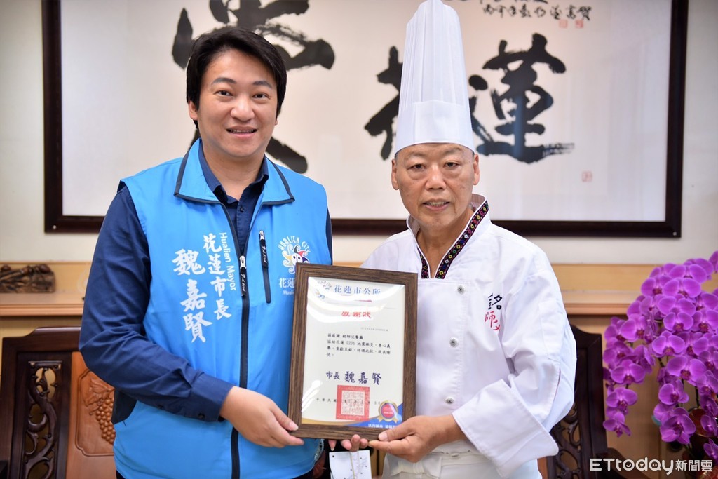 ▲花蓮市長魏嘉賢今3月30日表揚銘師父號召義煮團為災民提供料理服務,致贈感謝狀。(圖/花蓮市公所提供,下同)