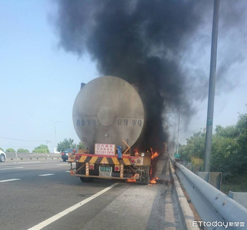 ▲1名蕭姓男子駕駛化學槽車,北上行經國道中山高下營段,突然車輪起火,台南市消防局據報迅速出動消防人車滅火。(圖/記者林悅翻攝,下同)