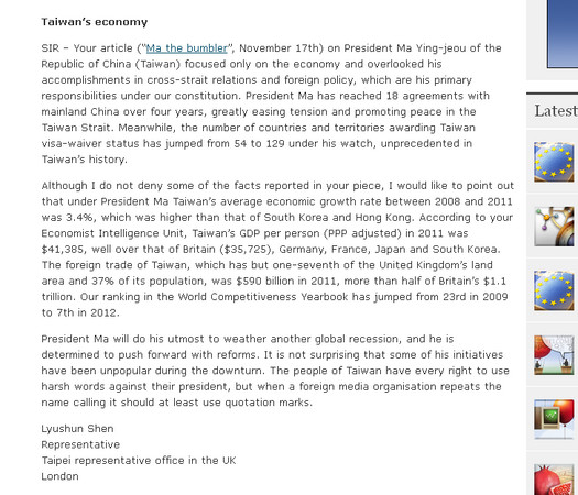 ▼經濟學人22日刊登駐英代表沈呂巡的投書。(圖/截取自經濟學人網站)