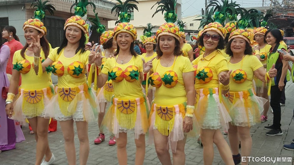 「這鳳梨裝穿起來辣哦」一群社區媽媽紛紛拿起手機拍照。這場「創作藝術成果發表暨森巴踩街嘉年華」活動,下午2時半起,社區男女老幼總動員,除了在地社區隊伍,長治、潮州、泰安國小森巴鼓隊也來參與,從萬金三皇宮出發到赤山村,大型鳳梨造型偶、萬金聖母玫瑰天使花車在隊伍中尤其吸晴,散發熱情活力。