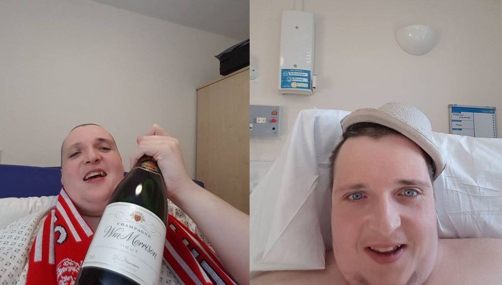 ▲克勞福德即使住院還會拿香檳拍照。(圖/翻攝自臉書/Matthew Tom Briscoe Crawford)