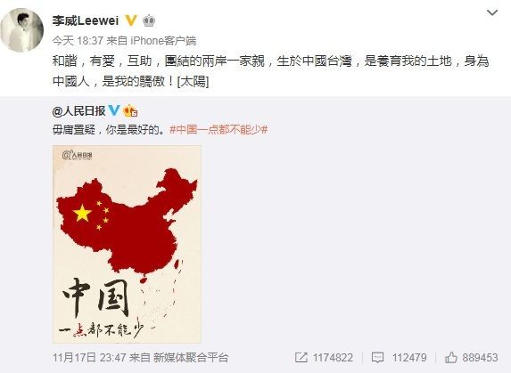 李威在微博不只轉發圖片,還寫下,「和諧,有愛,互助,團結的兩岸一家親,生於中國台灣,是養育我的土地,身為中國人,是我的驕傲!」