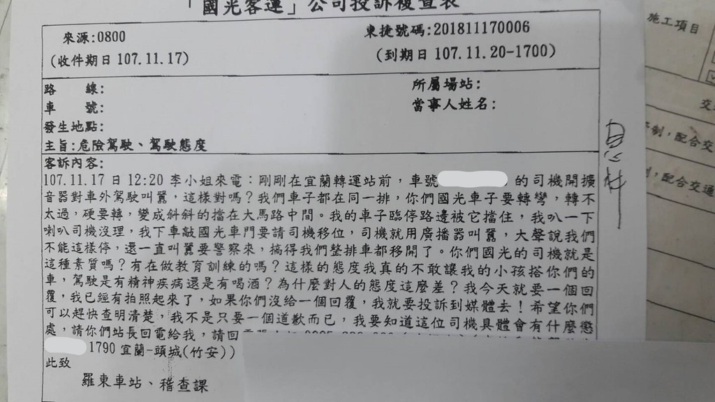 但是事後李姓司機卻收到公司投訴單,原來是女駕駛申訴說「剛剛在宜蘭轉運站前,車號KKA-XXXX的司機開擴音器對車外駕駛叫囂,這樣對嗎?我們車子都在同一排,你們國光車子要轉彎,轉不太過,硬要轉,變成斜斜的擋在大馬路中間。」